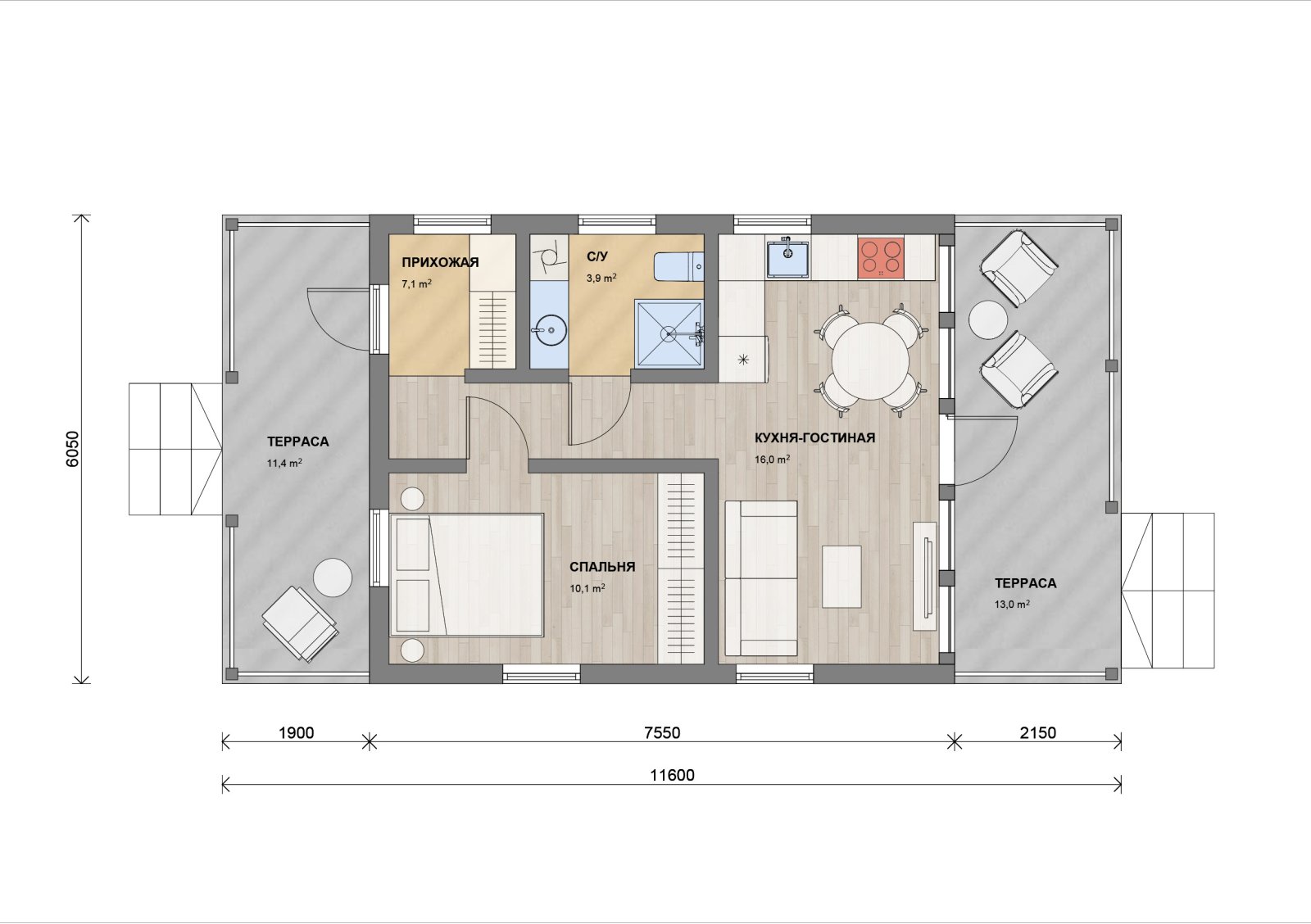 - В мокрых помещениях (санузел и тамбур) укладка керамогранита (с укладкой на ЦСП).