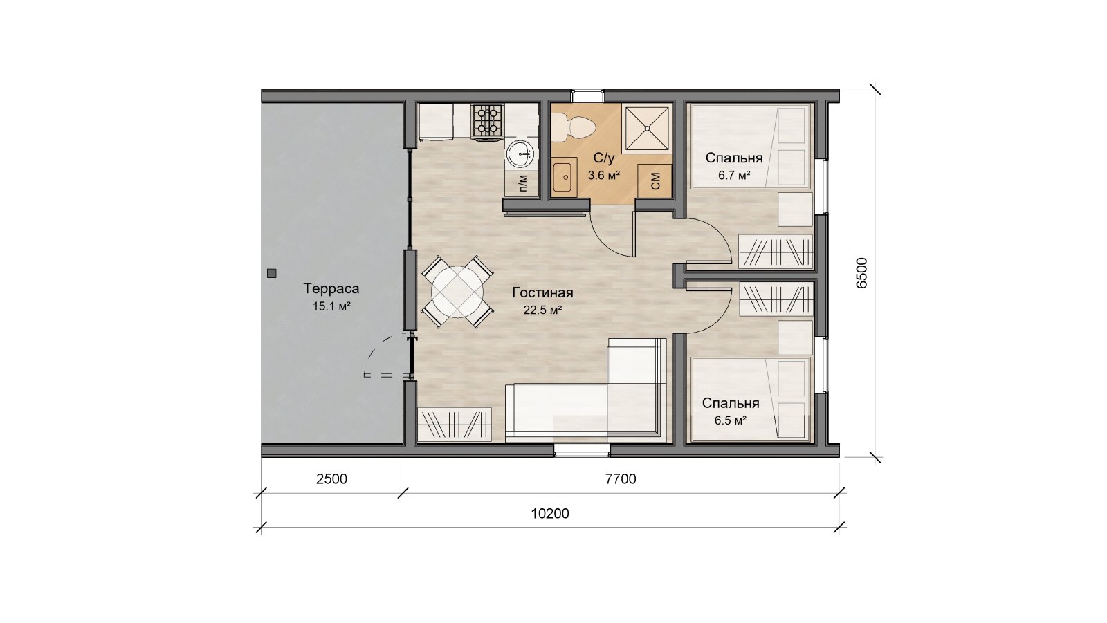 Фундамент: винтовые сваи с обвязкой брусом (в стоимость входит фундамент для участка без уклона).