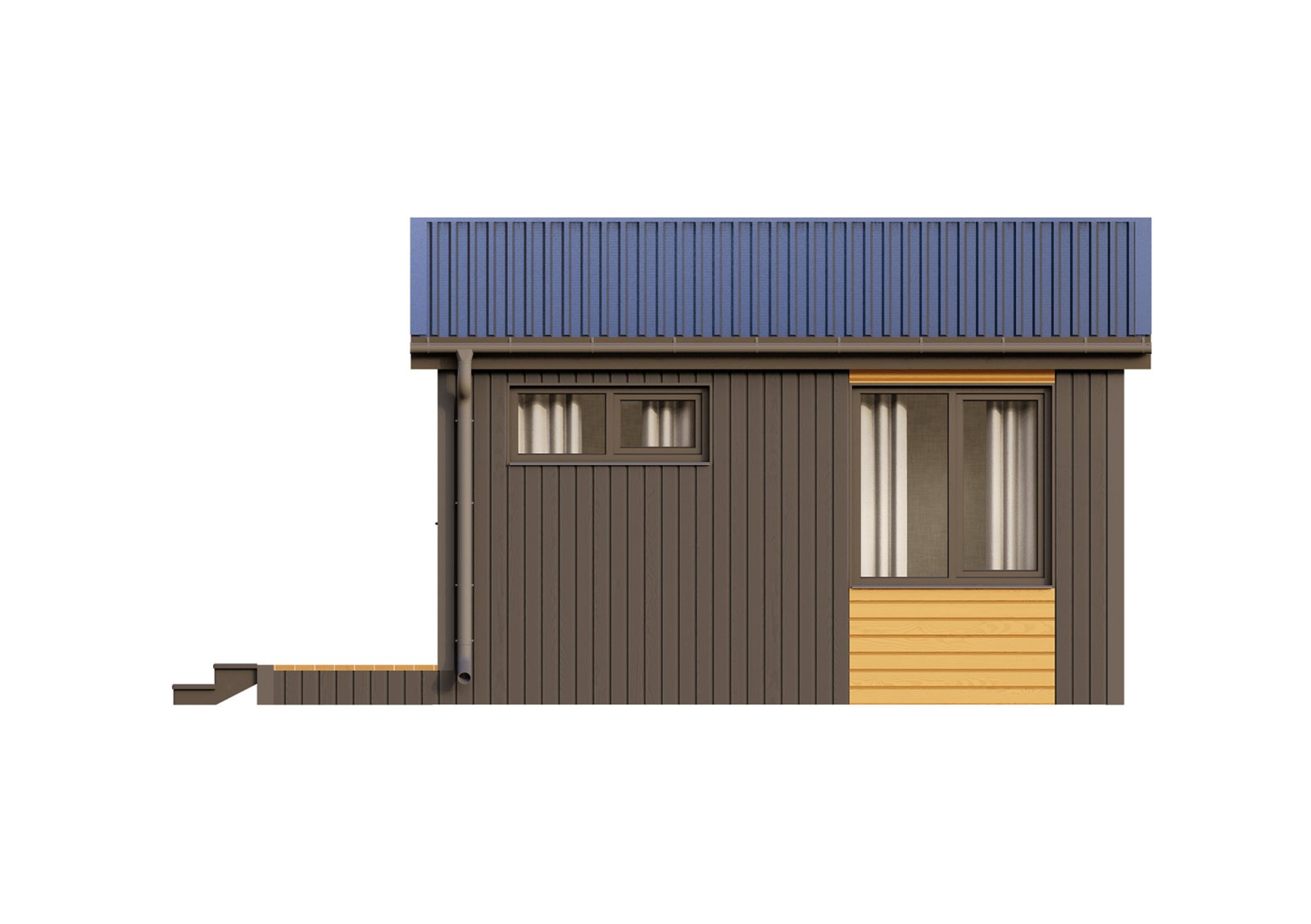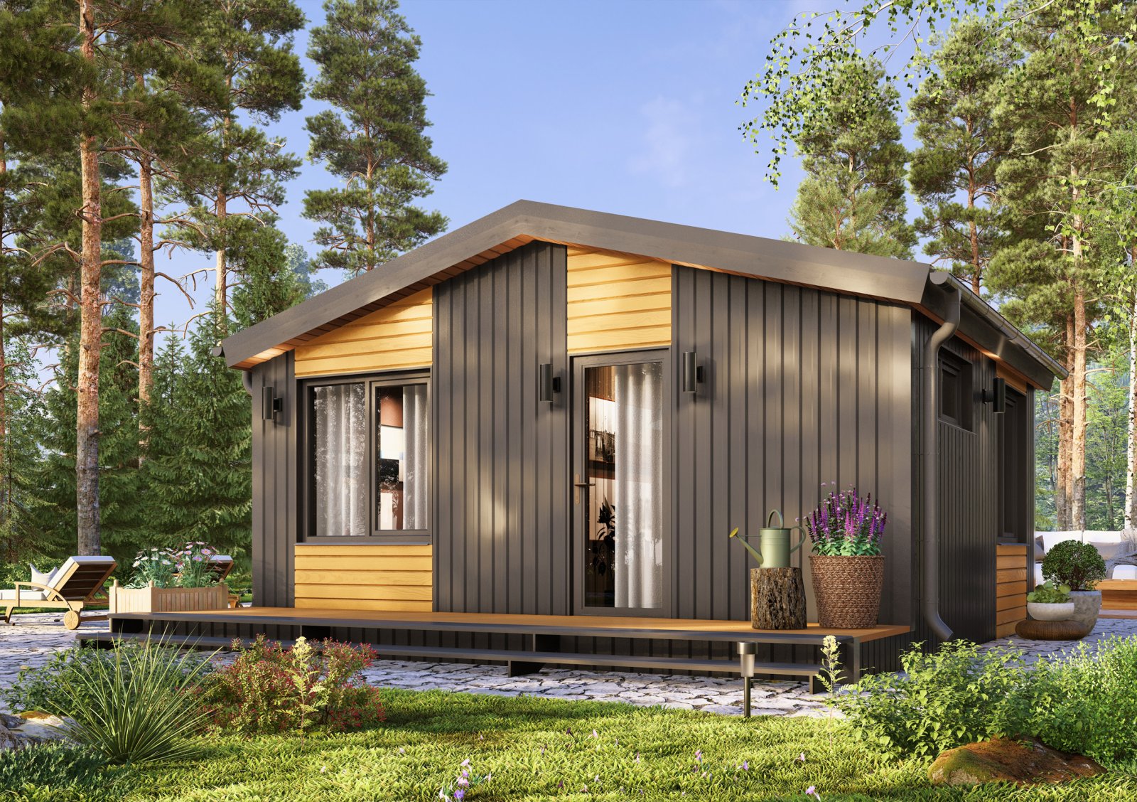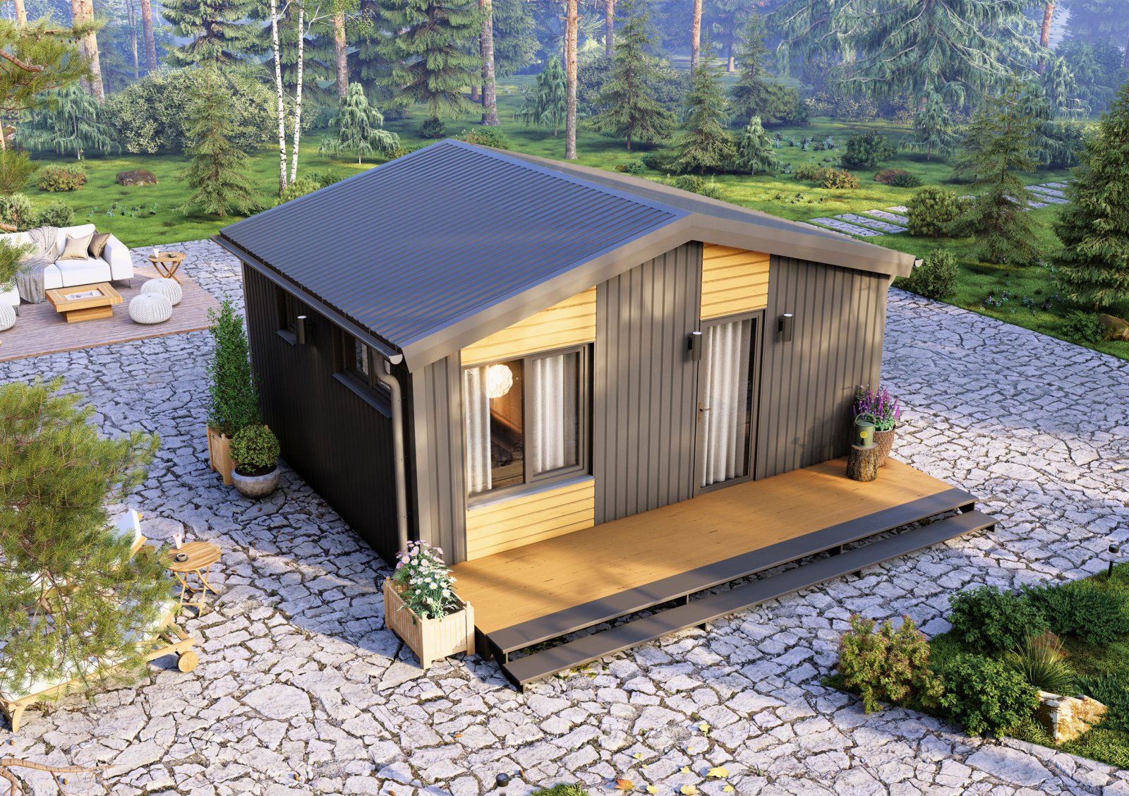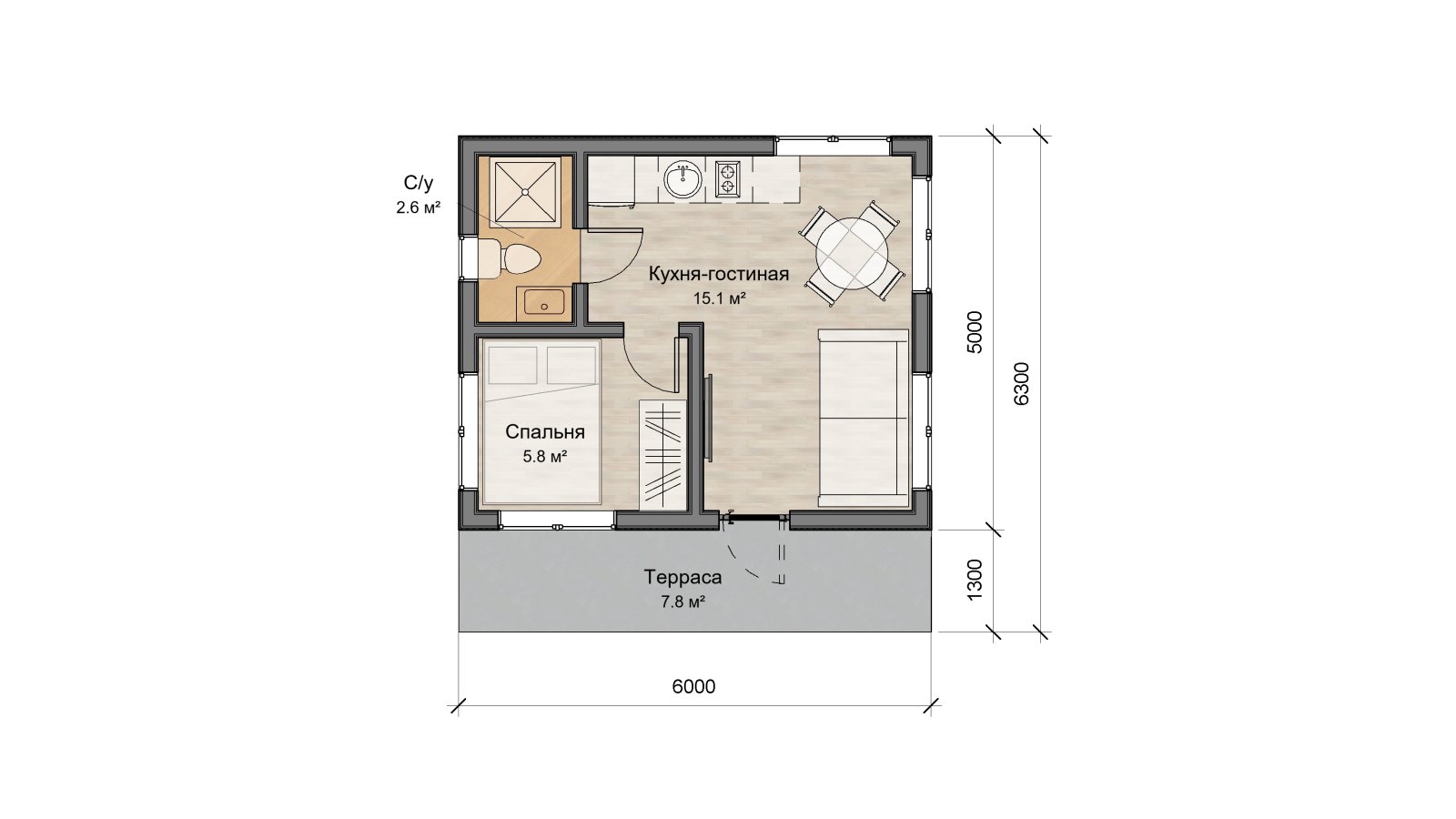 Глэмп 30+ - идеальный дачный дом – домик для отдыха. Небольших размеров, он при этом включает в себя всё, что необходимо для жизни. Кухня-гостиная 15,1 м2 вмещает в себя полноценную кухонную зону, отдельный обеденный стол и зону гостиной для отдыха. Отдельная спальня, площадью 5,8 м2, позволит в любой момент уединиться от всех. В санузле так же есть, всё что нужно для удобств. На площади 2,6 м2 расположена душевая кабина, унитаз и раковина с тумбой. Удобная открытая терраса позволит в любой момент выйти подышать свежим воздухом и выпить чашечку чая.