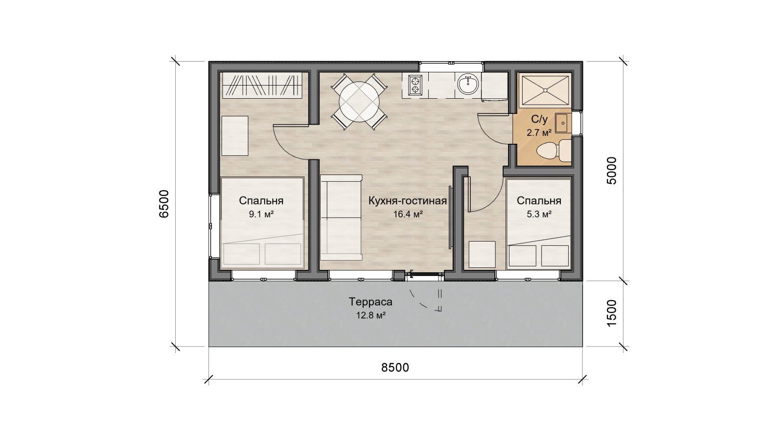 Стены выполнены из многослойного деревянного каркаса толщиной 150мм, утеплённого минеральной ватой.